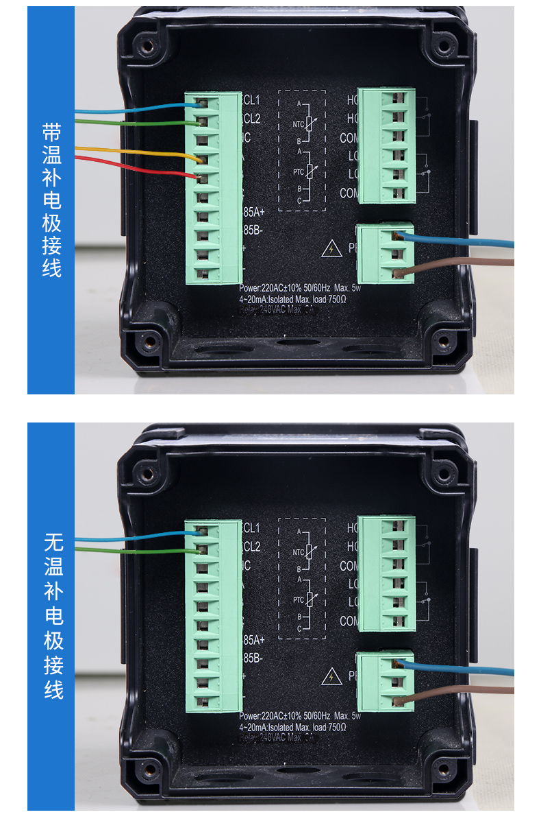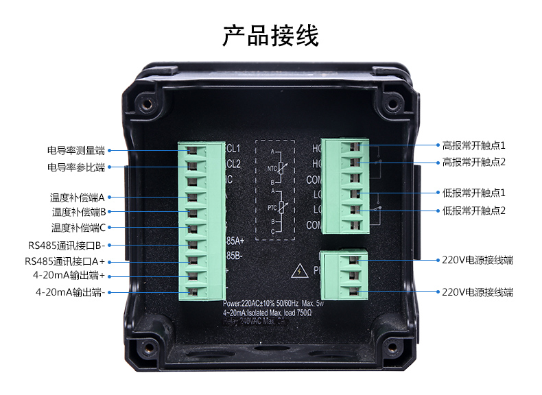 產品描述:儀器用于工業上電導/比電阻/鹽度/溶解固體總量及溫度的測量,如: 廢水,純凈水,環境監測,食品生產過程等,儀器可以盤面安 裝,壁掛安裝,管路安裝。儀器提供 2 路電流輸出,最大負載為 500Ω, 儀器提供 3 路控制用繼電器,繼電器最大承受電壓及電流為 5A/250VAC 或 5A/30VDC。 CN3