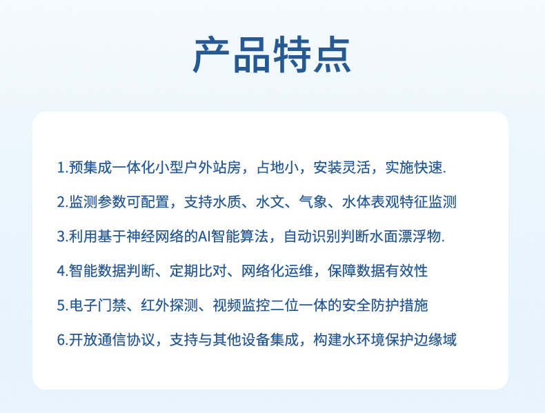 產(chǎn)品描述:為便捷監(jiān)測水環(huán)境,iWater X-Station小型水站采用預(yù)集成一體化小型戶外站房設(shè)計(jì),包括采水系統(tǒng)、預(yù)處理配水系統(tǒng)、分析儀器系統(tǒng)、輔助系統(tǒng)、安防系統(tǒng)、控制與數(shù)據(jù)服務(wù)系統(tǒng)、Al智能分析系統(tǒng)、集成站房等,具有4平方米、8平方米等多種規(guī)格,可實(shí)現(xiàn)水質(zhì)、水文、氣象等參數(shù)的自動(dòng)測量,以及水面漂浮物的識(shí)別,并進(jìn)行結(jié)構(gòu)化、非結(jié)構(gòu)化數(shù)據(jù)的管理與服務(wù)。依據(jù)流域河網(wǎng)水系特點(diǎn),在河道采用iWater X-Station系列小型水站進(jìn)行網(wǎng)格化布點(diǎn)監(jiān)控,結(jié)合信息化技術(shù),以大數(shù)據(jù)支撐水環(huán)境評(píng)價(jià)與預(yù)警、水質(zhì)水量科學(xué)調(diào)控,以及治理