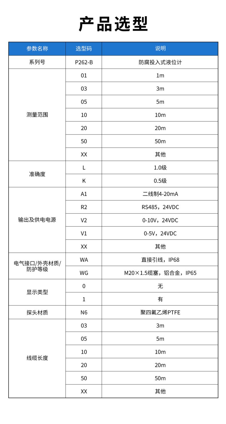 產品名稱:聯測_P262/P262-B防腐投入式液位計/水位計_陶瓷芯體_