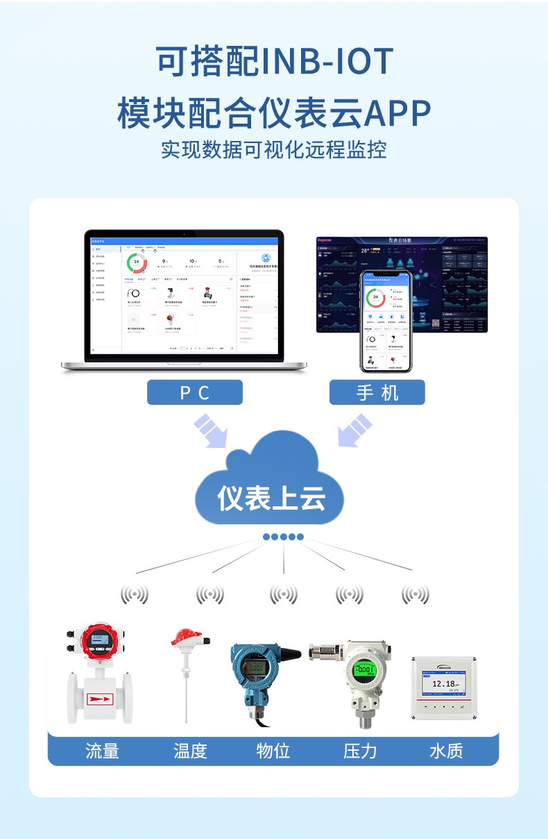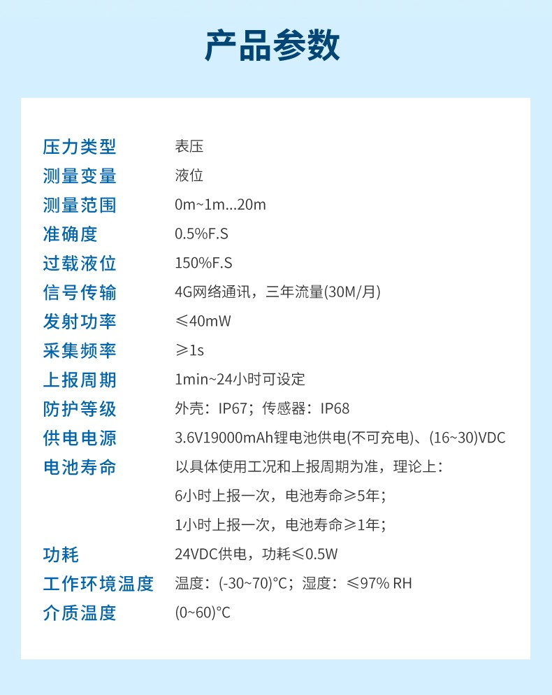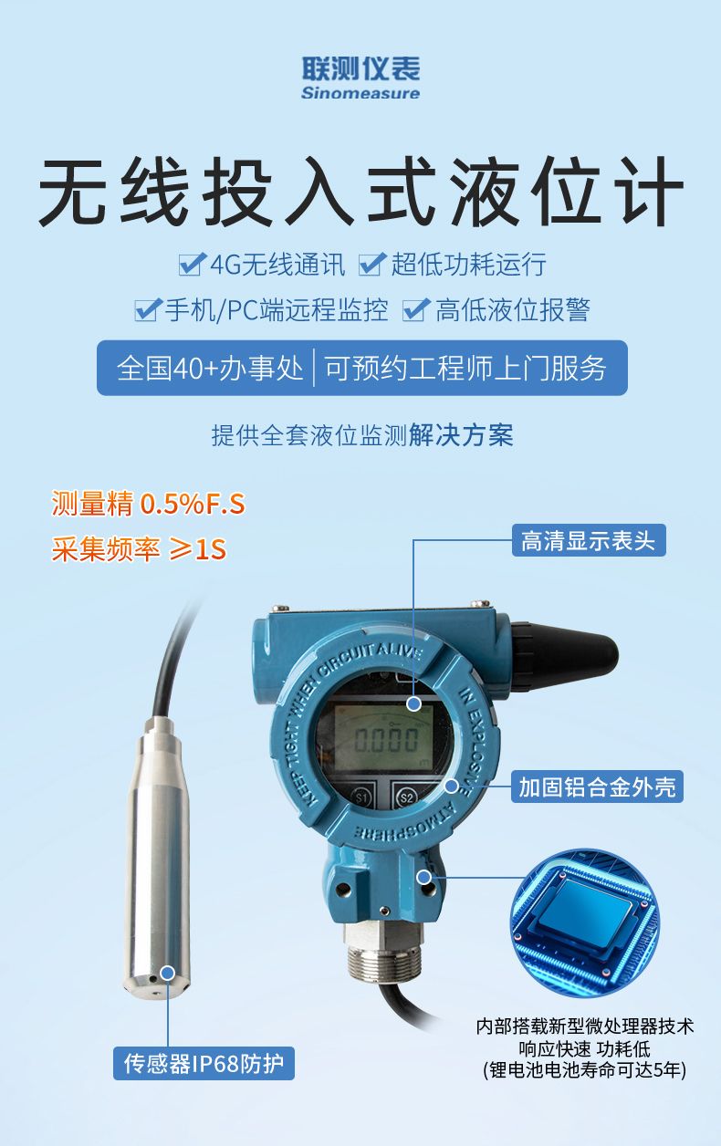 產(chǎn)品描述:無線投入式液位計(jì)是基于 4G 無線通訊網(wǎng)絡(luò)使液位的測量、變送、上報(bào)為一體的低功耗智能儀表。集成高靈敏度液位檢測元件,高精度信號調(diào)理電路,低功耗電池電源管理,豐富的 LCD 顯示界面于一體。周期性上報(bào)液位測量值、電池電量、信號質(zhì)量等數(shù)據(jù),并且能夠當(dāng)液位超出設(shè)置范圍時(shí)及時(shí)報(bào)警,提前預(yù)警故障隱患。本產(chǎn)品適合油田、水利、消防管網(wǎng)、自來水管網(wǎng)、城市供熱管網(wǎng)等智慧城市應(yīng)用場景。